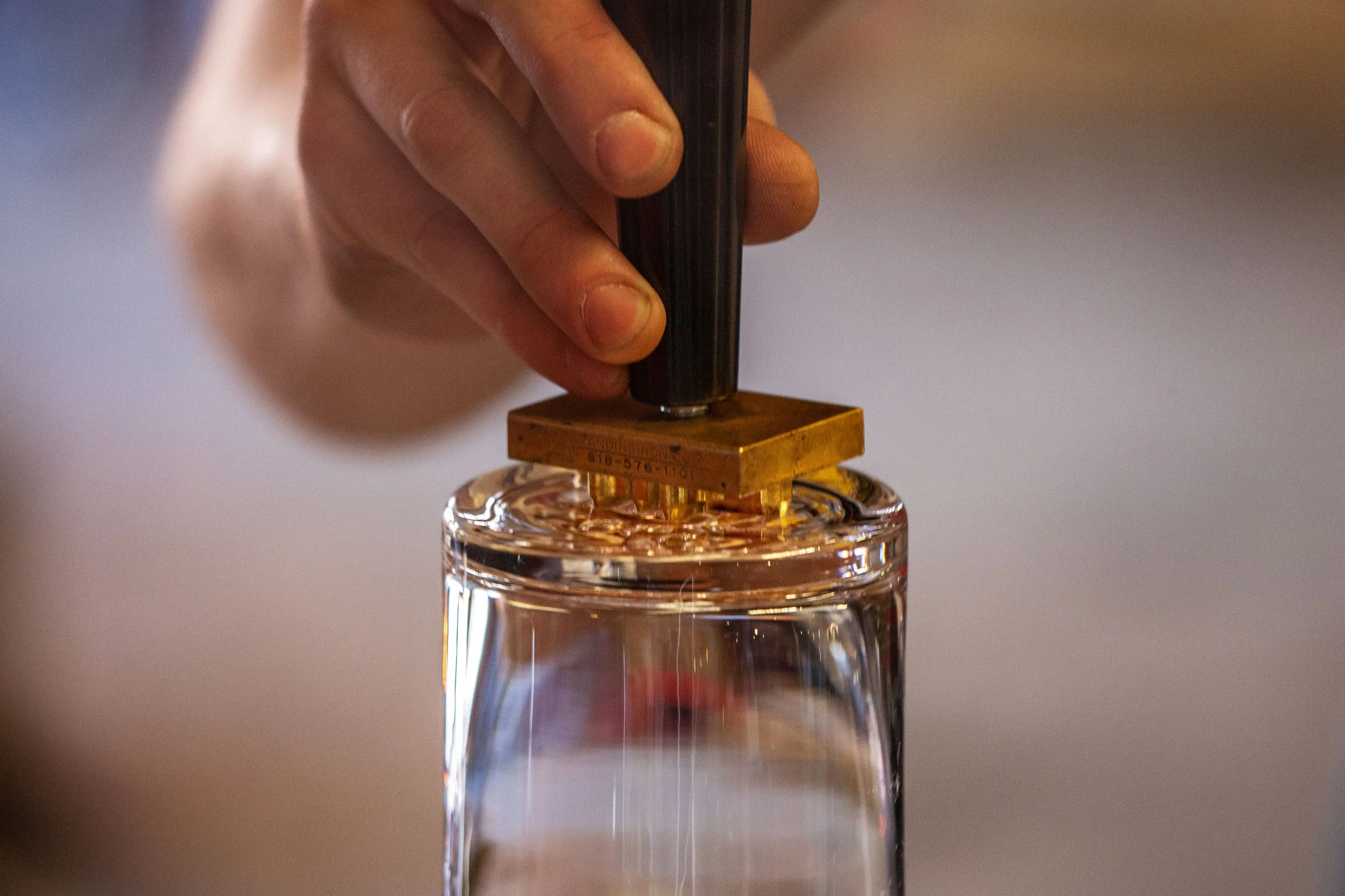 Below is an example of our own AO Glass logo being hot-stamped at the bottom of a beer glass.