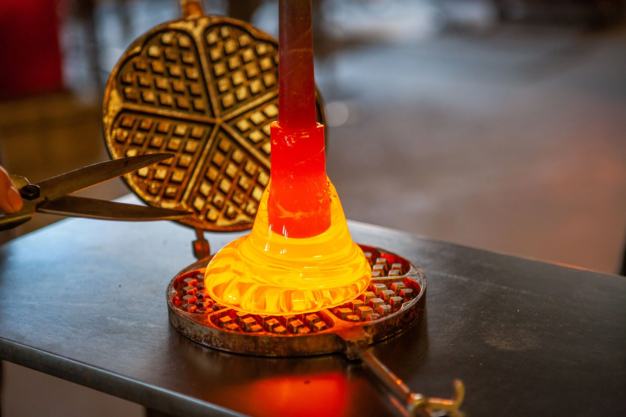 Enter our glass blowing factory with live glass blowing on the hot shop floor.